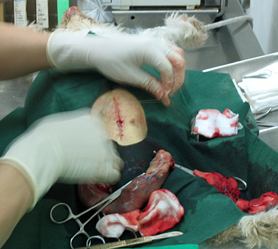醫師說狗狗子宮約橡皮筋厚度,因為妮妮的子宮蓄膿,所以漲得那麼大!!!
